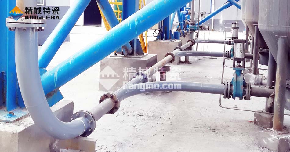 輸灰管道很有可能會(huì)因?yàn)橐恍┓蹓m的混合物不斷沖刷而導(dǎo)致較為嚴(yán)重的磨損現(xiàn)象。特別是在彎頭的部分,因?yàn)闅饬饔锌赡軙?huì)在一側(cè)改變其流向,因此對(duì)于外側(cè)的磨損相對(duì)是較為嚴(yán)重的。針對(duì)以前我們采用的蝦米節(jié)離心澆鑄復(fù)合陶瓷管磨損嚴(yán)重的工況,而且部分已經(jīng)打了背包,經(jīng)研究發(fā)現(xiàn)復(fù)合陶瓷的微觀裂紋多,質(zhì)脆易碎,容易局部脫落失效,而且脫落后無(wú)法修補(bǔ)。后來(lái)結(jié)合我們老廠使用精城牌耐磨陶瓷管道的經(jīng)驗(yàn),采用氧化鋁陶瓷,氧化鋁陶瓷貼片的氧化鋁含量≥95%,而且全部是高溫相a-Al?O?,燒結(jié)溫度高達(dá)1670℃,確保材料的品質(zhì)。從以往耐磨陶瓷管道實(shí)際的磨損情況來(lái)看,內(nèi)襯耐磨陶瓷的管道使用壽命是離心澆筑復(fù)合陶瓷管的5倍以上。所以特邀請(qǐng)湖南精城特瓷的專(zhuān)家團(tuán)隊(duì)到我司來(lái)現(xiàn)場(chǎng)勘察,解決輸灰管道易磨損的難題。